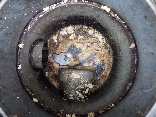 清掃前。防臭弁周辺にグリスの塊が出来ています。これが目詰りの原因となる事が多いです。