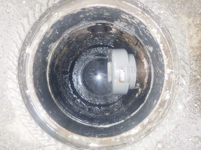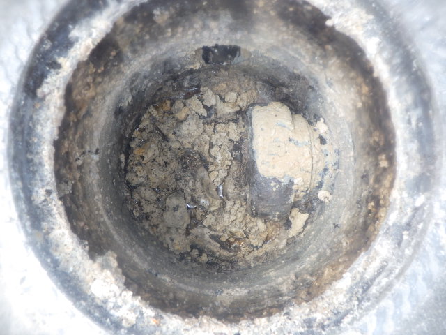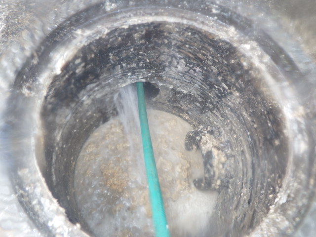 溢れたことにより、建物側の配管内に汚泥が付着したため、高圧洗浄にて清掃していきます。