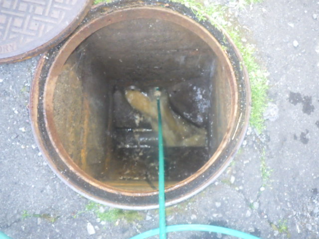 外部インバート桝より高圧洗浄で配管内の汚れ・詰りの原因を除去していきます。